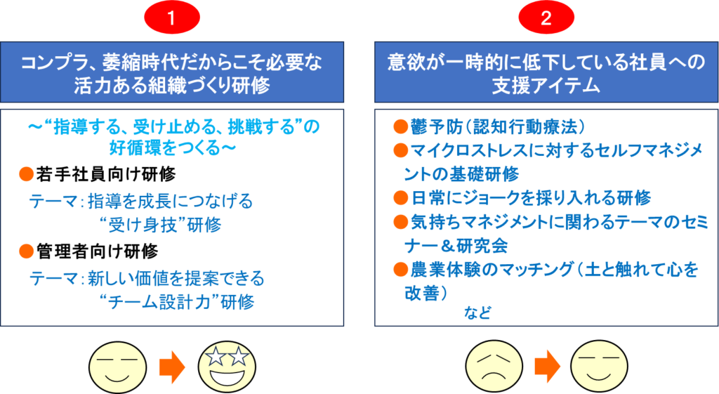 その実現のために、若手と管理者それぞれの資質を高める個別育成と、相乗効果を生み出すチーム力強化の両面から、実践的なプログラムを提供します。