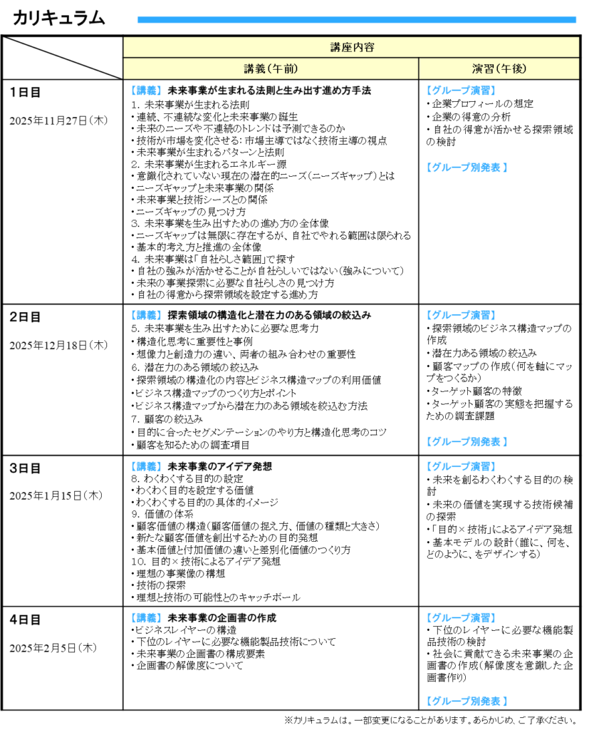 なお、技術シーズからのニーズ指向の事業を創出する(シーズtoビジネスのテーマ)、抽象度の高い目的から事業を創出する(ニーズtoビジネスのテーマ)の双方の演習を予定しています。