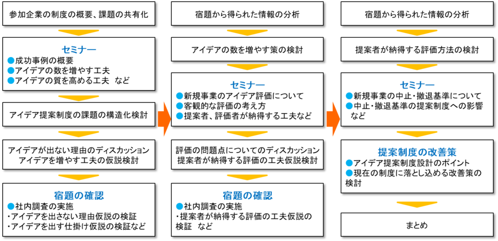 本セミナー&交流研究会は、参加企業の背景や課題の共有化を行ない、ディスカッションしながら進めていきます。なお、弊社にて、アイデア創出の仕組みや評価制度に関する知見・仮説をセミナー形式で発信し、それらを呼び水として議論を深め、実効性ある改善策の創出をめざしていきます。